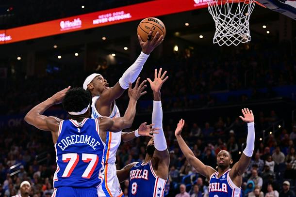 Oklahoma City's Shai Gilgeous-Alexander puts up a shot between three Philadelphia defenders in the Thunder's NBA victory over the 76ers