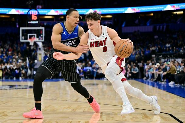 Orlando's Desmond Bane, at left guarding Miami's Pelle Larsson, scored 37 points to lead the Magic over the Heat 117-108 and into the NBA Cup semi-finals