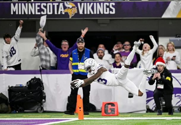 Minnesota's Jordan Addison caps a 65-yard touchdown run with a dive into the end zone as the Vikings defeated visiting Detroit to clinch an NFL playoff berth for the Green Bay Packers