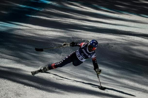 Halgren, pictured here on March 7, won silver at the men's standing super-G