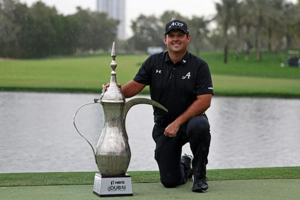 Patrick Reed shows off the Dubai Desert Classic trophy