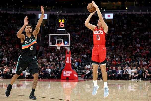 Houston's Reed Sheppard launches a three-pointer in the Rockets come-from-behind defeat of the San Antonio Spurs