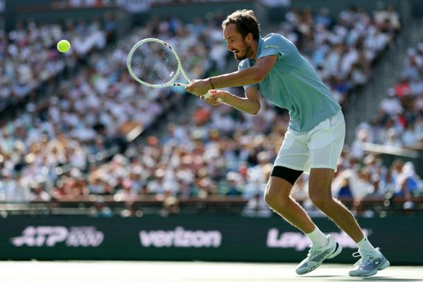 Russian Daniil Medvedev returns eyes up a shot in loss to Jannik Sinner in the Indian Wells ATP Masters final