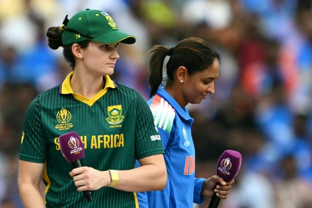 South Africa's captain Laura Wolvaardt (L) and India's skipper Harmanpreet Kaur prepare for interviews after the World Cup final coin toss