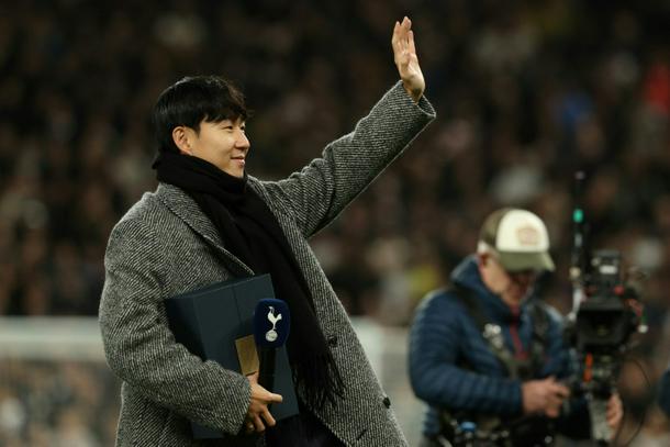 Former Spurs star Son Heung-min acknowledges fans at the Tottenham Hotspur Stadium