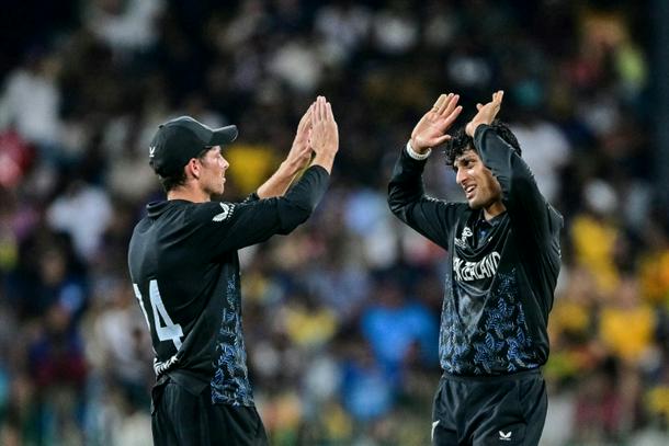 New Zealand's Rachin Ravindra (R) celebrates with captain Mitchell Santner after taking the wicket of Sri Lanka's Dushan Hemantha