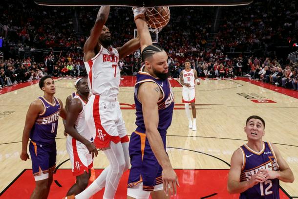 Houston's Kevin Durant Houston Rockets dunks against Dillon Brooks in the Rockets' NBA victory over the Phoenix Suns