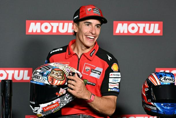 Ducati Lenovo Team rider Marc Marquez of Spain shows his helmet during a press conference ahead of the September 28 Japanese MotoGP Grand Prix at Mobility Resort Motegi in Motegi, Tochigi prefecture on September 25, 2025