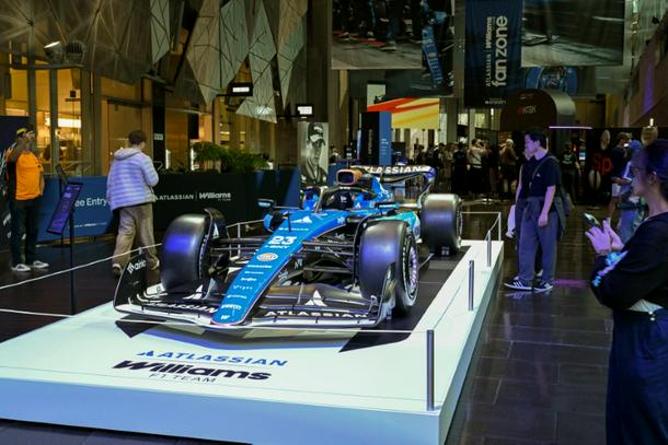 People walk through a Williams F1 team fan zone in Melbourne