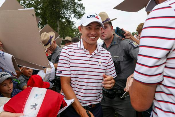 USA's Collin Morikawa signs autographs during a practice round before the Ryder Cup at Bethpage Black in New York