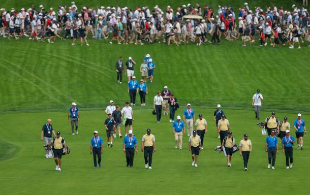 Team Europe walk on course during a practice round prior to the Ryder Cup at Bethpage Black