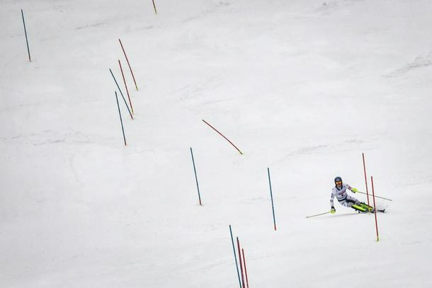 In the slalom, the men must negotiate up to 75 rapid-fire gates
