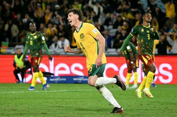 Australia’s Jordan Bos (C) celebrates after scoring the only goal against Cameroon in Sydney