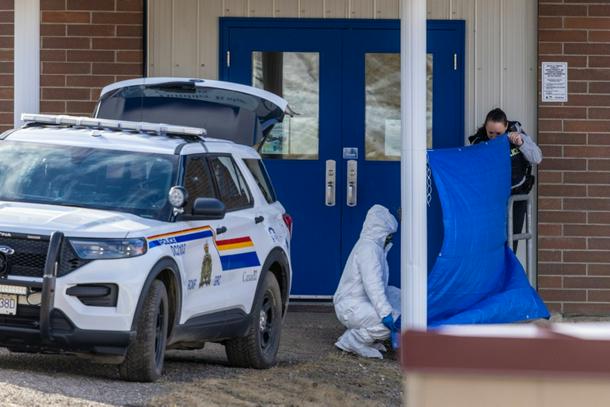 Investigators work the crimes scene at Tumbler Ridge Secondary School after a mass shooting rocked the rural community of Tumbler Ridge, Canada