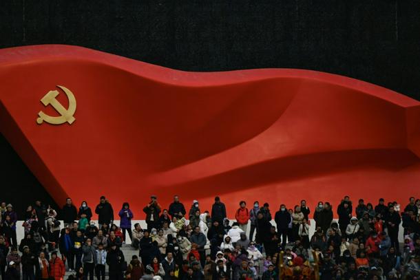 People watch a Chinese New Year performance of traditional Chinese dances with a sculptural flag of the Communist Party seen in the background at the plaza of the Museum of the Communist Party of China in Beijing on March 1, 2026, ahead of the opening of the annual session of the National People's Congress (NPC).