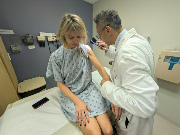 Heidi Tarr, who was diagnosed with melanoma years after regularly using a tanning bed, is examined by dermatologist Pedram Gerami