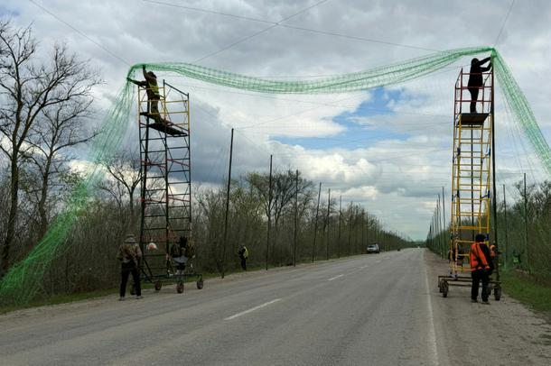 Ukrainian servicemen cover the road with a net to protect vehicles from drone attacks in the Zaporizhzhia region