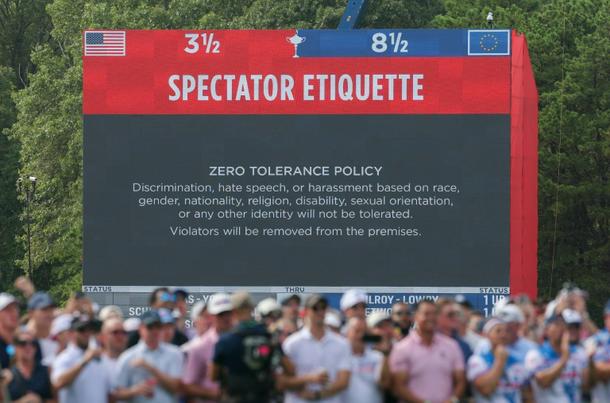 A video board displays spectator etiquette at the Ryder Cup, were raucous USA fans made life hard for a charging Europe side