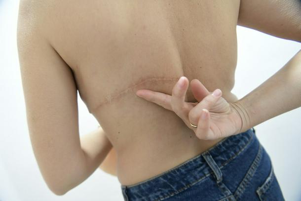 Juana Fernandez shows her scar from breast cancer surgery at the Amama office in Seville