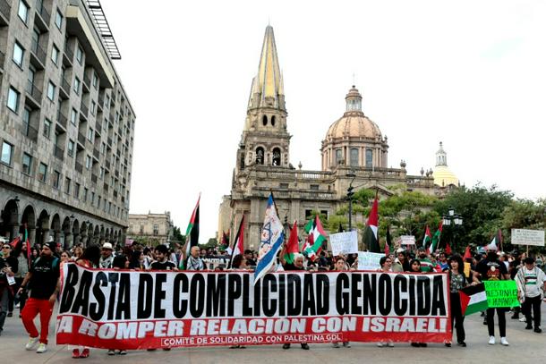 Demonstrators in Mexico display a banner that reads "No more genocidal complicity, break relations with Israel" at a rally Tuesday