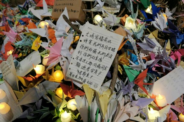Mourners left paper cranes and candles at a vigil held outside the Wang Fuk Court apartment blocks
