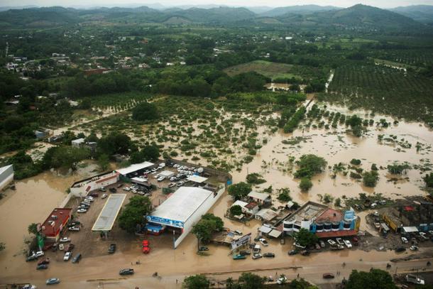 This aerial view taken during a Mexican Navy flyover shows flooded streets after heavy rains in Poza Rica, in Veracruz state