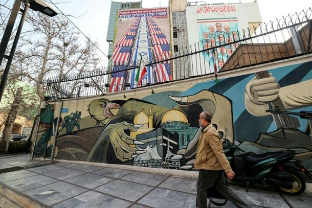 Anti-US and anti-Israel banners hang on a building in Palestine Square in Tehran