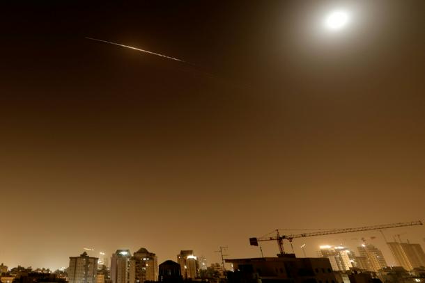 Rocket trails are seen in the sky above the Netanya, Israel