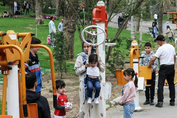 Despite the bombardment in Iran, families gathered in Tehran’s Melat Park, with men smoking water pipes and children playing to mark the 13th day after Nowruz, the Persian New Year, when people traditionally picnic outdoors.