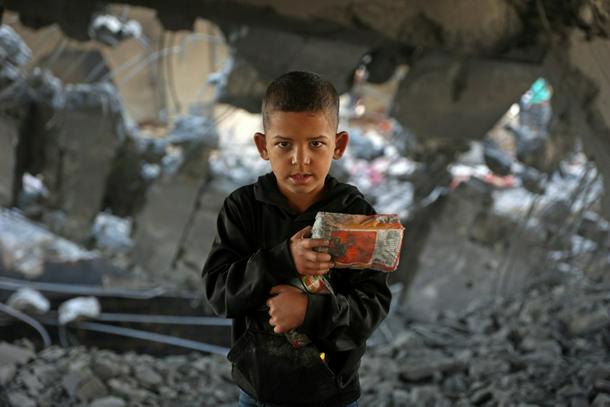 A Palestinian boy holds his belongings amid the debris of a damaged building in Zeitoun