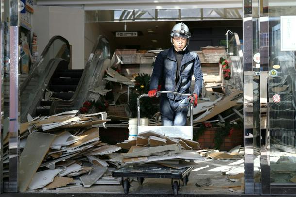 A worker clears debris at a shopping center damaged by the earthquake in Hachinohe City, Aomori Prefecture on December 9, 2025