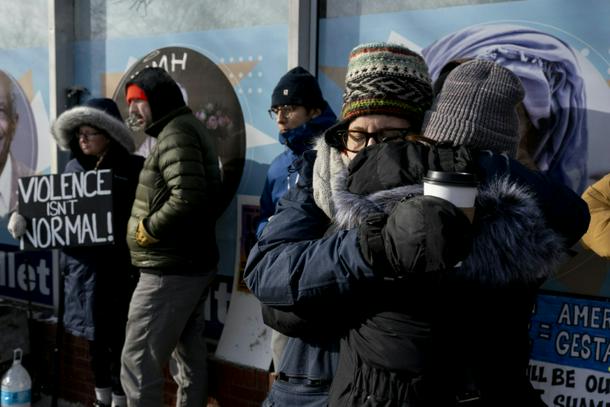 Two women embrace as mourners gather at a makeshift memorial in the area where nurse Alex Pretti was shot dead by federal immigration agents in Minneapolis, Minnesota