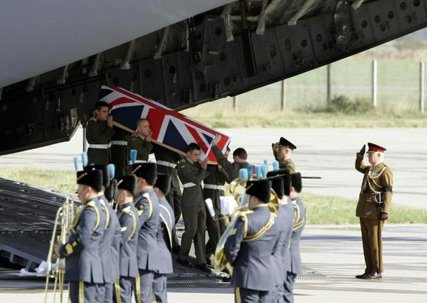 The coffin containing Joseph David Windall of the British Royal Marines arrived at a base in Scotland on September 12, 2006 after he was one of 14 British servicemen killed in Afghanistan in an air crash