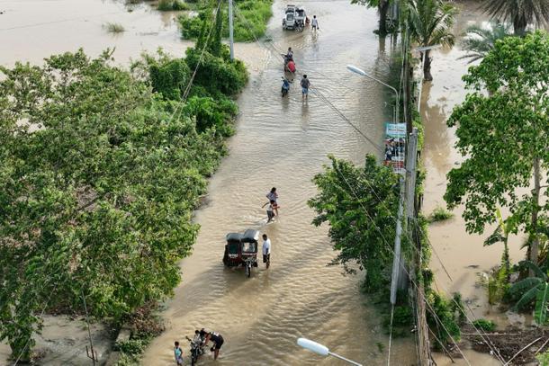 People wade through the water along a submerged street in Tuguegarao City in the Philippines' Cagayan province