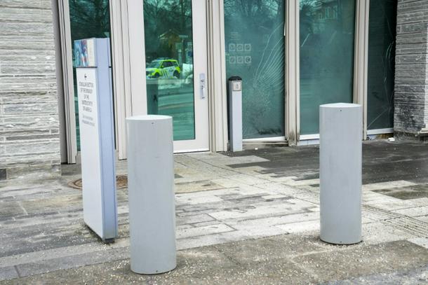 Shattered glass could be seen in the snow outside the building’s entrance, as well as cracks in a thick glass door. Overhead lamps dangled from wiring, and there were black marks on the ground at the foot of the door, presumably from the blast.