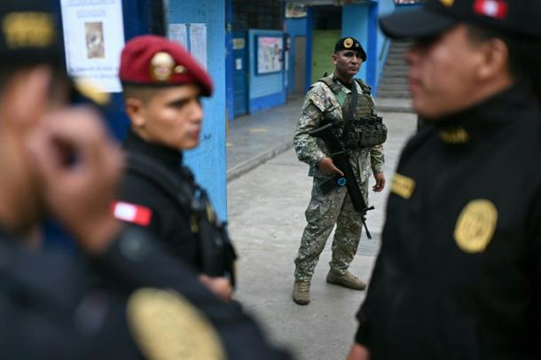 A member of the Armed Forces and police officers stand guard at a school before its reopening as a polling station in Lima on April 13, 2026, after logistical failures prevented tens of thousands of people from voting in presidential and legislative elections the day before. Peru's Keiko Fujimori looked set to face a runoff against a conservative rival after a troubled first-round presidential election on April 12, 2026 marred by logistics foul-ups, police raids and allegations of fraud.
