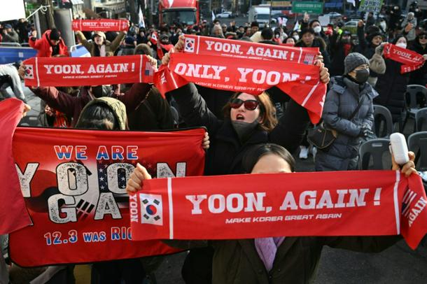 Supporters of South Korea's impeached former president Yoon Suk Yeol in front of the Seoul Central District Court during a hearing in January.