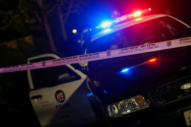 A Los Angeles Police Department patrol car behind police tape in the Brentwood neighborhood of Los Angeles, California