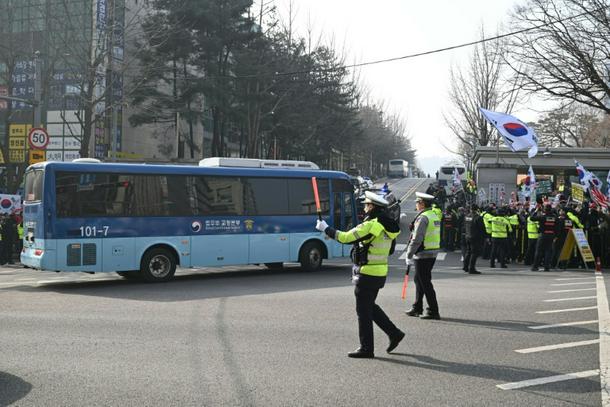 A blue bus believed to be transporting South Korea's impeached former president Yoon Suk Yeol arrives at the Seoul Central District Court in Seoul on January 16, 2026, as his supporters (R) gather in front of the court