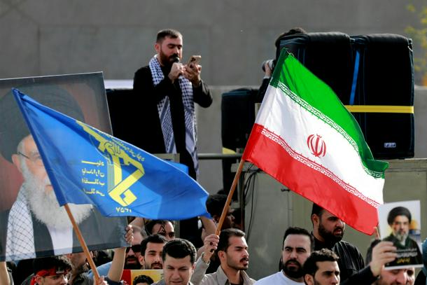 People wave flags of Iran and of its Islamic Revolutionary Guards Corps (IRGC) during a demonstration in solidarity with Iran in Baghdad