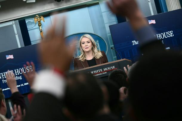 White House Press Secretary Karoline Leavitt takes questions during the press briefing in the Brady Briefing Room of the White House in Washington, DC, on November 12, 2025.