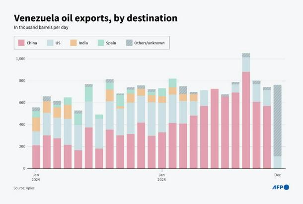 Infographic chart showing Venezuela oil exports, according to data compiled by trade analysis firm Kpler.