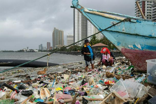 Manila residents look for recyclables after Typhoon Fung-wong swept trash ashore