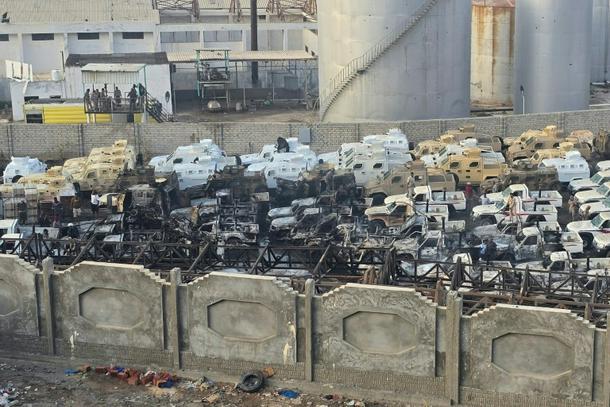 AFP footage of the port showed dozens of parked military vehicles and pick-ups, several of which were burnt out and smouldering as workers hosed them down.