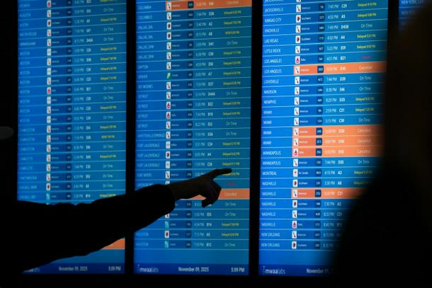A departures board at the Reagan National Airport in Arlington, Virginia, on day 40 of the government shutdown