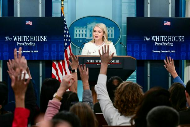 White House Press Secretary Karoline Leavitt takes questions during a press briefing at the White House on October 23, 2025