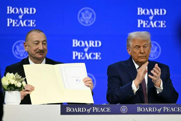 Azerbaijan's President Ilham Aliyev holds a signed founding charter of the "Board of Peace" as US President Donald Trump applauds during the World Economic Forum in Davos, Switzerland