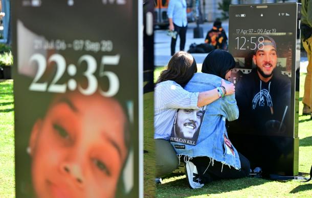 Bereaved parents and family members view images of deceased children displayed at the 'Lost Screen Memorial' in Los Angeles, an art installation featuring 50 children who lost their lives due to online harm