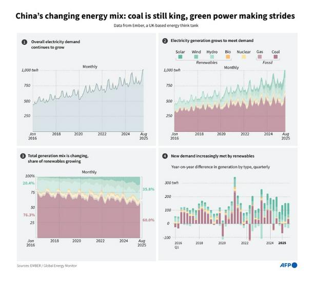 Infographic illustrating changes in China's energy mix, highlighting the growth of renewables, and at the same time showing the continued dominance of coal, according to data from Ember, a UK-based think tank.