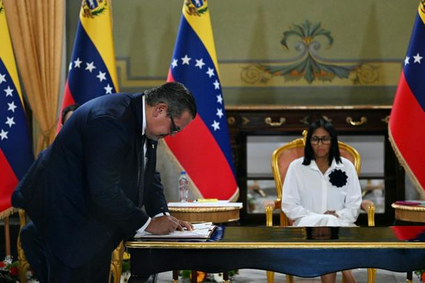 Chevron Venezuela Mariano Vela signed the deals next to Venezuela's interim President Delcy Rodriguez during a ceremony at the Miraflores Palace in Caracas